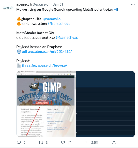 Numerous malware, including AuroraStealer, IcedID, Meta Stealer, RedLine Stealer, and Vidar are being delivered to victims’ machines through bad actors impersonating brands such as Adobe Reader, Gimp, Microsoft Teams, OBS, Slack, and Thunderbird using Google Ads.