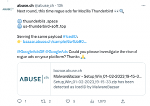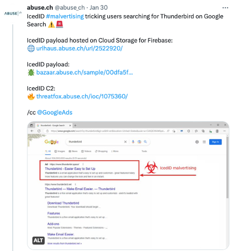 Spamhaus Technology’s partner abuse.ch and The Spamhaus Project are both observing a significant increase in this activity. On January 30th, abuse.ch reported on Twitter that victims were being lured with impersonator Thunderbird Google Ads, leading to spoofed pages, which, once clicked on, delivered an IcedID payload to the unwitting victim’s device.