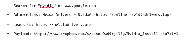 Spamhaus researchers have linked fake Nvidia domains with Aurora Stealer and Vidar malware. Some of the Google Ads purposefully have typos, which we presume is to try and evade detection, for example: